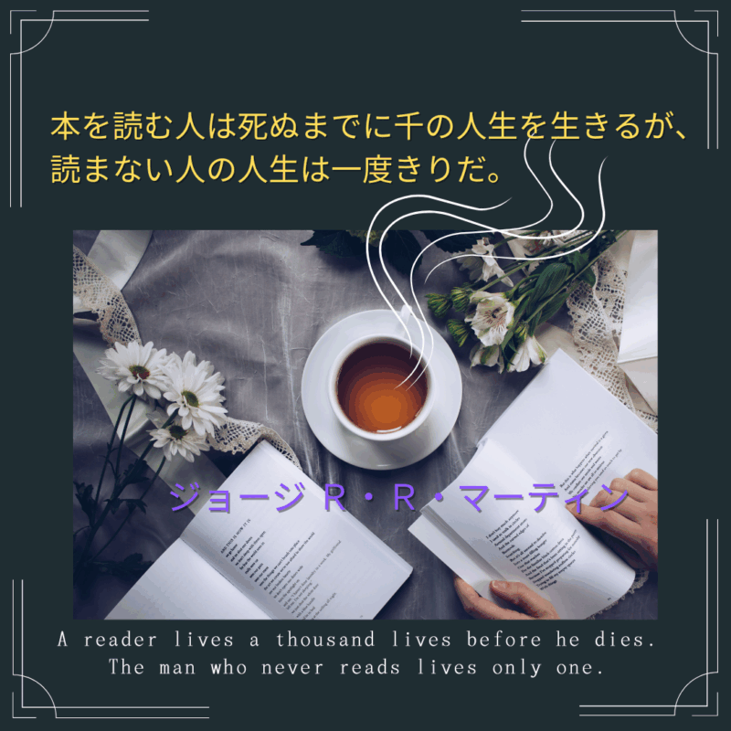 本についての名言:本を読む人は死ぬまでに千の人生を生きるが、、、本の名言TwitterFacebookはてブPocketLINEコピー 2025.09.22本を読む人は死ぬまでに千の人生を生きるが、読まない人の人生は一度きりだ。ジョージR・R・マーティンA reader lives a thousand lives before he dies. The man who never reads lives only one.