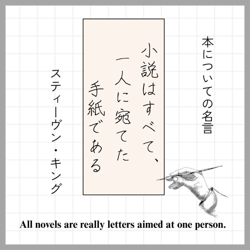 本や読書についての名言本の名言TwitterFacebookはてブPocketLINEコピー 2025.11.11小説はすべて一人に宛てた手紙である。スティーヴン・キングAll novels are really letters aimed at one person.by Stephen King
